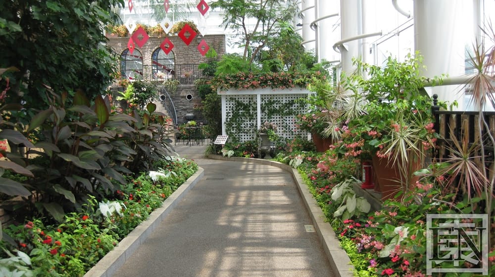Wenn man durch den Eingang kommt, blickt man zuerst auf das Gewächshaus mit gepflegten Bäumen und Blumenrabatten.