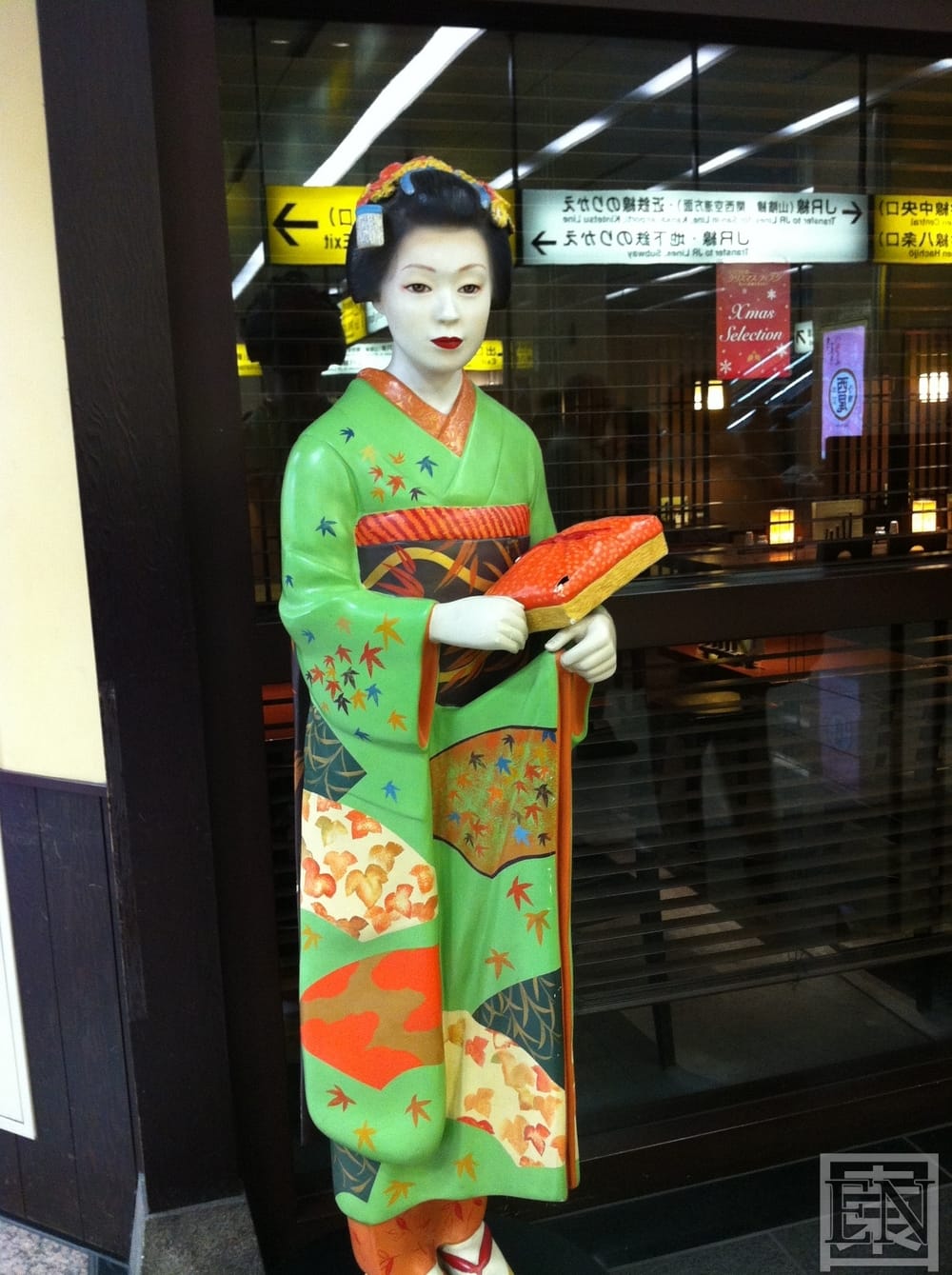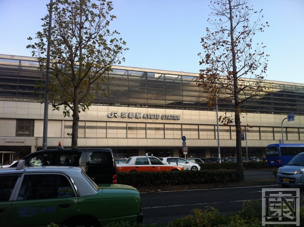 2 Stunden und 20 Minuten später waren wir dann in Kyoto. Ich vermisste ein großes Schild auf dem „Kyoto Station“ stand und das ich touristenmäßig gleich nach der Ankunft fotografieren konnte. Dafür gab es eine Maiko Figur unten an der Treppe. Das Kyoto Station Schild sah ich erst draußen am Bahnhof.